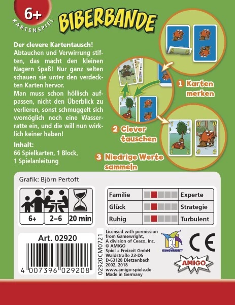 Biberbande von Amigo ist ein kurzweiliges lustiges Kartenspiel, das schon seit über 20 Jahren Freude in die Familienspielzeiten bringt. Das Ziel ist klar: Biberkarten mit möglichst niedrigen Werten zu bekommen. Jeder Spieler hat vier Karten verdeckt vor sich liegen, aber nur zwei davon darf er sich zu Beginn ansehen. Danach gibt es nur noch wenige Möglichkeiten, herauszufinden was auf der Vorderseite abgebildet ist. Dann werden die Karten in der Runde geschoben und getauscht – hoffentlich so, dass am eigen Platz niedrige Werte übrigbleiben! Spezielle Sonderkarten erlauben es, sich während des Spiels die ein oder andere Karte anzusehen oder eine schlechte Karte seinen Mitspielern zuzuschieben.