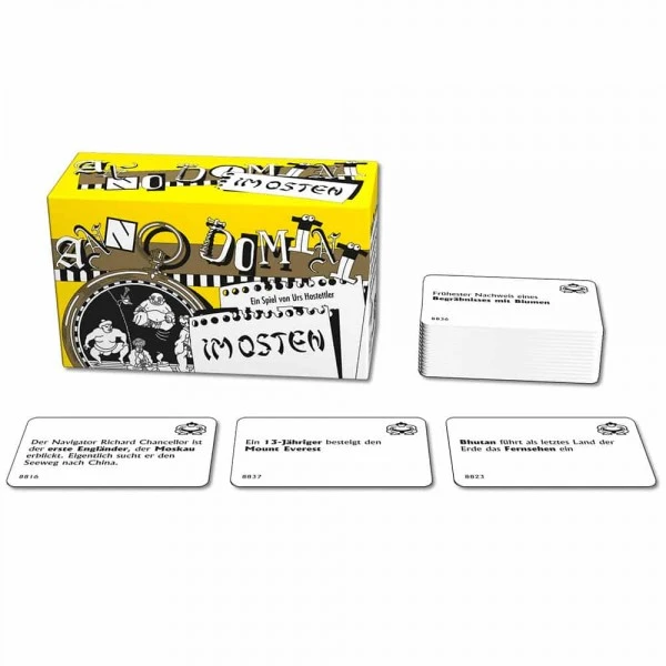Bei Anno Domini müssen Ereignisse in die richtige zeitliche Abfolge gebracht werden. Es kommt dabei jedoch nicht auf exaktes Wissen an. Denn wer weiß schon, ob „Bhutan als letztes Land der Erde das Fernsehen einführte“ bevor oder nachdem „Indiens Bevölkerung 1 Milliarde erreichte“. Wer gut bluffen kann hat beste Chancen seine Karten als Erster loszuwerden und damit zu gewinnen. Die richtige Mischung aus bekannten und kuriosen Ereignissen garantiert jede Menge Spaß für die ganze Familie.