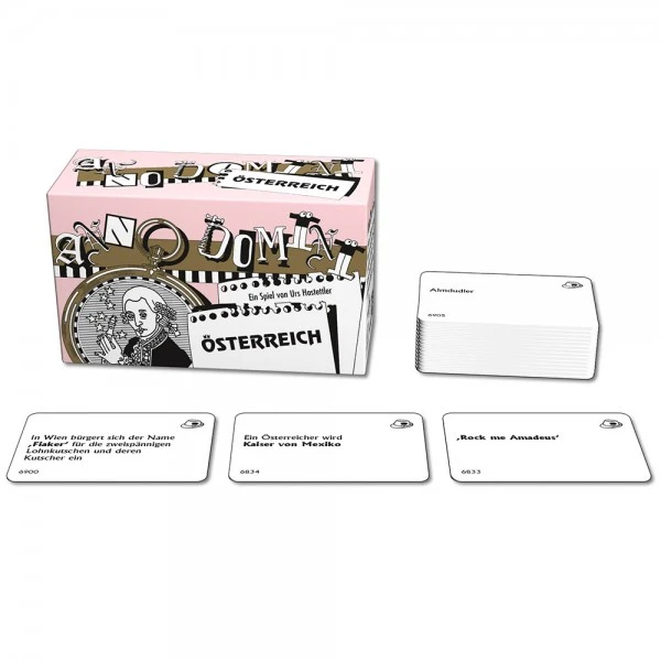 Bei Anno Domini müssen Ereignisse in die richtige zeitliche Abfolge gebracht werden. Es kommt dabei jedoch nicht auf exaktes Wissen an. Denn wer weiß schon, ob „der Bürgermeister von Wien, bisher zum letzten Mal, gevierteilt wurde“ bevor oder nachdem „Wien mit dem Prater ein wunderbares Erholungsgebiet und Vergnügungsgelände“ bekommt. Wer gut bluffen kann hat beste Chancen seine Karten als Erster loszuwerden und damit zu gewinnen. Die richtige Mischung aus bekannten und kuriosen Ereignissen garantiert jede Menge Spaß für die ganze Familie. Ein kommunikatives Partyspiel für 2-8 Spieler ab 10 Jahren. Spieldauer ca. 30 Minuten.