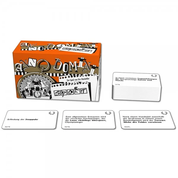 Anno Domini – Sport von Urs Hostettler Bei Anno Domini müssen Ereignisse in die richtige zeitliche Abfolge gebracht werden. Es kommt dabei jedoch nicht auf exaktes Wissen an. Denn wer weiß schon, ob „die Stoppuhr erfunden wurde“ bevor oder nachdem „Tabak-Weitspucken olympische Disziplin wurde“. Wer gut bluffen kann hat beste Chancen seine Karten als Erster los-zuwerden und damit zu gewinnen. Die richtige Mischung aus bekannten und kuriosen Ereignissen garantiert jede Menge Spaß für die ganze Familie. Spieldauer ca. 30 Minuten Empfohlen ab 10 Jahren Für 2 bis 8 Spieler Inhalt: 341 Karten, 1 Spielregel