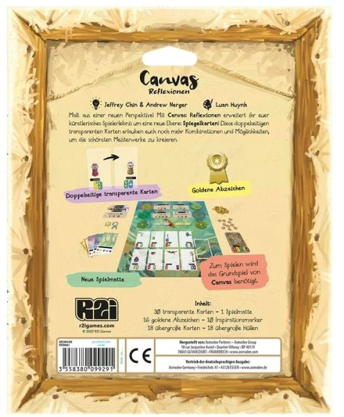 Mit Canvas – Reflexionen erweitert ihr euer künstlerisches Spielerlebnis um eine neue Ebene: Spiegelkarten. Diese doppelseitigen Karten erlauben mehr strategische Möglichkeiten, sodass ihr jetzt noch vielfältigere Kombinationen aus Element-Symbolen kreieren könnt. Durch die neue Spielmatte habt ihr außerdem eine größere Auswahl an Kunstkarten (selbst wenn euch die Inspirationsmarker ausgehen sollten) und könnt so besser vorausplanen.