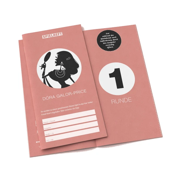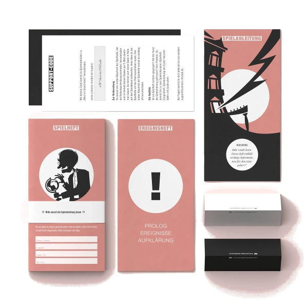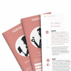 • Inhalt: 1 Spielanleitung, 8 Spielhefte, 1 Ereignisheft (beinhaltet Prolog, Ereignisse und Auflösung), 8 Namensschilder, 1 Support-Code