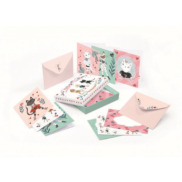 Einen guten Anlass zum Kartenschreiben gibt es immer! Ob an den Brieffreund, an die Oma oder für Glückwünsche, diese besonderen Karten verleihen dem geschriebenen Wort einen besonderen Charme. In einer Korrespondenzbox sind 10 Karten mit 10 Umschlägen enthalten. Die metallischen Effekte sind nicht nur auf der Box selbst, sondern natürlich auch auf allen Karten und Umschlägen. Im „Lucille“ Design verzaubern fantasievolle Katzenmotive die Karten mit Blumen oder Herzchen Details.