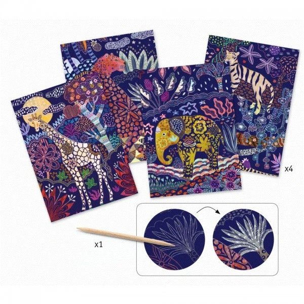 • 4 Bildkarten, die als Kratzbild bearbeitet werden sollen, Kratzspatel inclusive