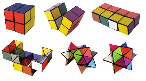 Durch raffinierte Faltkunst lässt sich der Würfel mit einer Seitenlänge von 5,5 cm, zweiteilen. Obwohl dies schon verblüffend ist, können die beiden Teile in 2 eindrucksvolle Zwölfsterne verwandelt werden.