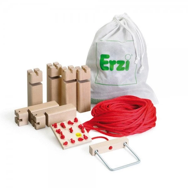 • Inhalt: 6 Hartholzklötze,1 Bügel mit Seilaufnahme,12 Schnüre à 2x2m,1 Aufbewahrungsbeutel,1 Spiel- und Montageanleitung