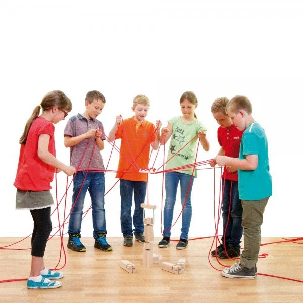 Ohne Zusammenarbeit ist die Gruppe beim Teamturm aufgeschmissen: Das tolle Spiel von Erzi fördert die Teambildung und macht wirklich Spaß. Jedes Mitglied der Gruppe hält einige der wichtigen Fäden in der Hand, mit denen die Turmklötze aufgehoben und gestapelt werden sollen. Und nun muß miteinander gesprochen werden, denn alle können nur gemeinsam diese Aufgabe lösen!