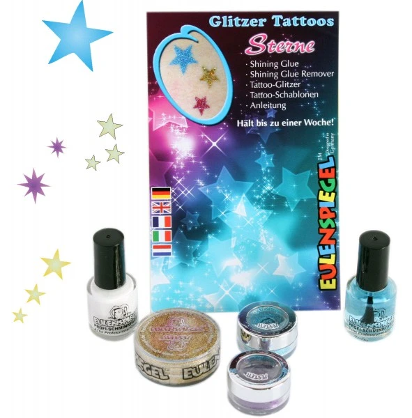 Die glitzernde Tattoos sind ein Knaller! Mit diesem Eulenspiegel-Set aus verschiedenen hochwertigen Glitzern, Tattoo-Schablonen, Glitzerkleber und Kleber-Entferner lassen sich wunderschöne Glittersterne auf die Haut zaubern.