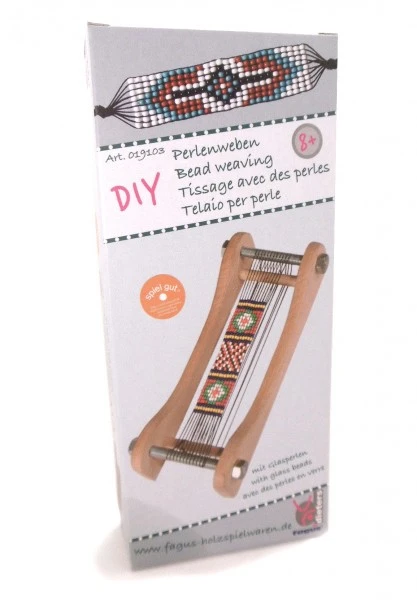 • Inhalt: Webrahmen aus heimischem Buchenholz (20 x 9 x 4 cm), ca. 50 Gramm bunte Perlen aus Glas, Zwirn und Nylonfaden, Spezialnadel und Anleitung.