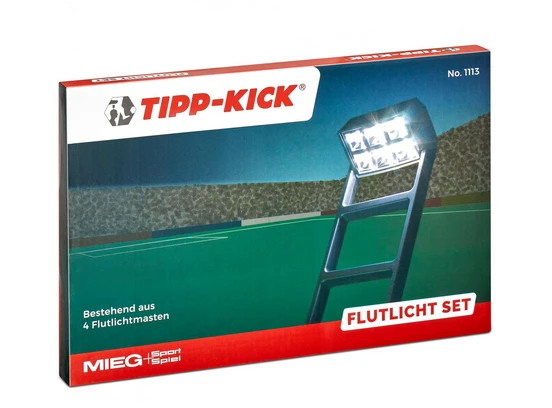 Mit der Flutlichtanlage, die zu allen TIPP-KICK Spielen passt, können auch abends spannende Partien gespielt werden. 4 Masten mit jeweils 6 LED Lichtern beleuchten das Spielfeld und bringen Spannung auf den Rasen. Pro Mast benötigt man 3 AA Batterien (nicht im Lieferumfang enthalten) Der einzelne Mast ist max. 19 cm hoch, die Standfläche beträgt 5 x 8 cm.