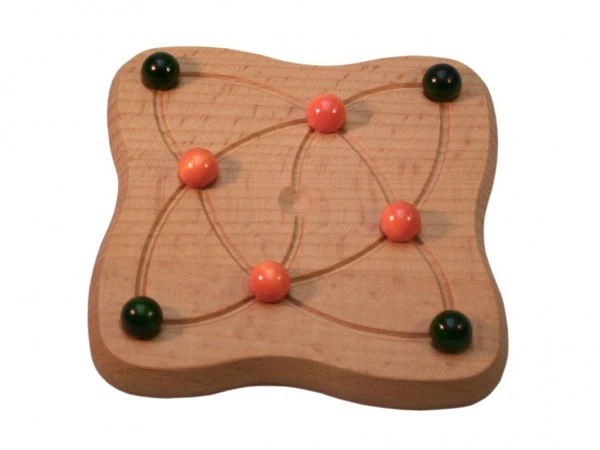 Ein pfiffiges Spiel mit ansprechendem Design. Spielsteine sind Holzkugeln in orange und grün