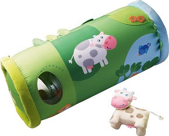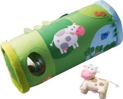 Die Bauernhof Krabbelrolle von Haba ist mit freundlichen Bauernhofmotiven gestaltet, eine kleine Stoffkuh ist auch dabei.