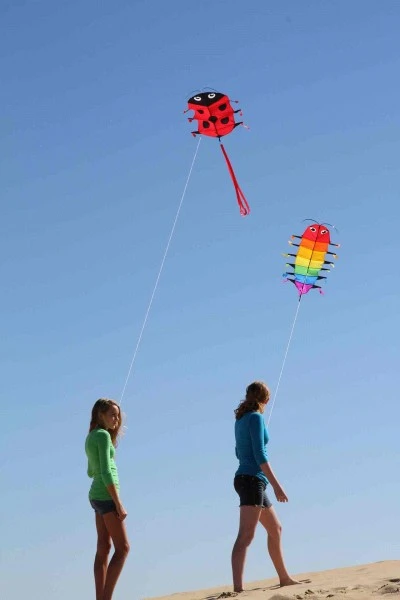 Die Raupenfüße mit bunten Bändern an den Seiten flattern und krabbeln lustig im Wind, der Drachenstab in der Mitte hält die Form stabil.