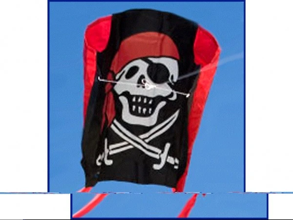 Kleiner einleiniger Kinder-Drachen mit Piraten-Motiv. Er misst 43cm x 33cm und ist aber trotzdem incl. Schnur in einer nur 7cm großen Reißverschlußtasche verpackt. Ein idealer Reisedrache – alles dabei!