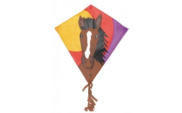 Dieser robuste Kinderdrachen in klassischer Rautenform hat ein Pferdemotiv mit buntem Hintergrund auf dem Segel aus Ripstop-Polyester.