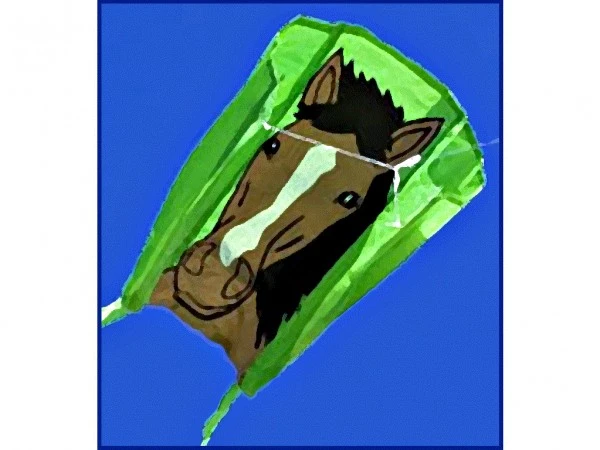 Kleiner einleiniger Kinder-Drachen mit Pferd-Motiv. Er misst 43cm x 33cm und ist aber trotzdem incl. Schnur in einer nur 7cm großen Reißverschlußtasche verpackt. Ein idealer Reisedrache – alles dabei!