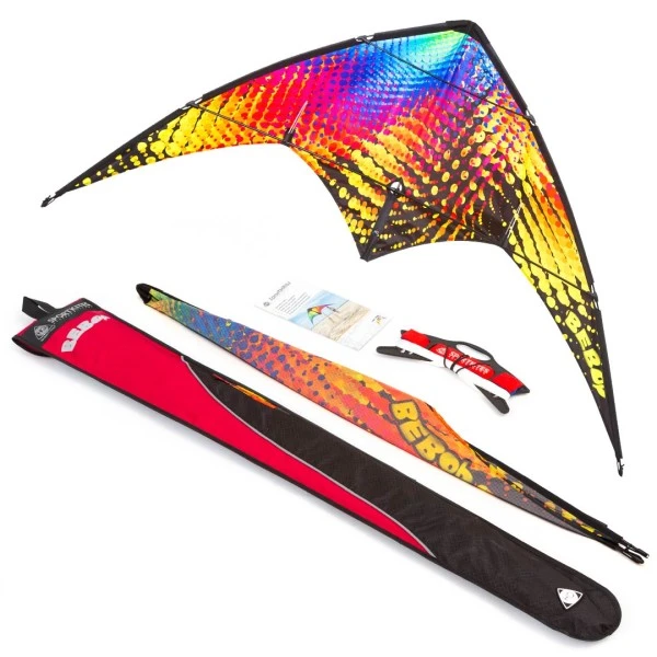 Der BEBOP ist ein sehr einfach zu fliegender Lenkdrachen für Piloten ab 8 Jahren. Sein komplett aus 4 mm Fiberglasrohr gefertigtes Gerüst verleiht ihm einerseits schon bei recht wenig Wind gute Flugeigenschaften, andererseits eine hohe Flexibilität und große Knautschzone bei Abstürzen. Das kräftige Segelmaterial trägt noch weiter zur Stabilität des Drachens bei. Durch seine – schon seit einiger Zeit beim Yukon bewährte – 4-Punkt-Gleitwaage ist der Drachen immer optimal eingestellt und das Gerüst wird auch bei kräftigem Wind optimal gestützt.