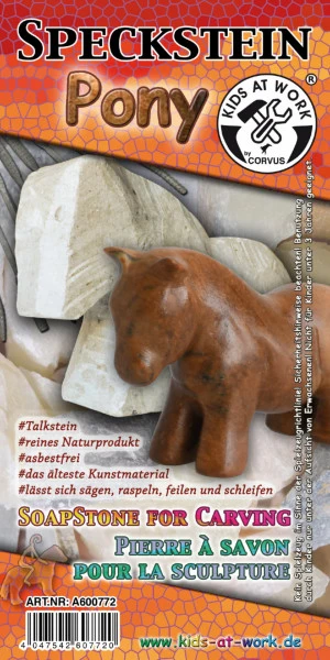 Ein toller Speckstein zum Basteln in Pony Form von der Qualitätsfirma Kids at Work. Raspeln, Schleifen, Feilen – mit dem Speckstein können sich die Kids ordentlich austoben und aus der vorgefertigten Figur ein ganz eigenes Kunstwerk zaubern. Von der Feile bis zum Schleifpapier eignen sich vielfältige Werkzeuge, um der Kreativität freien Lauf zu lassen.