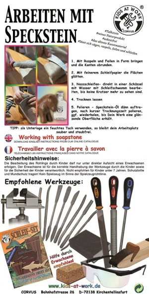 Specksteine sind herrlich weich und führen so schnell zu tollen Ergebnissen, auf die die Kids stolz sein können. Die Arbeit mit dem Naturmaterial stimuliert die Fantasie und, verbessert die Auge-Hand-Koordination und macht einfach Spaß. Übrigens: Auch als kleines Geschenk an Mama und Papa oder die beste Freundin ist das fertige Speckstein-Kunstwerk natürlich prima geeignet!