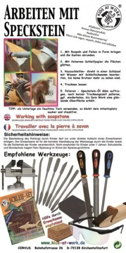 Ein toller Speckstein in T-Rex Form von der Qualitätsfirma Kids at Work. Raspeln, Schleifen, Feilen – mit dem Speckstein können sich die Kids ordentlich austoben und aus der vorgefertigten Figur ein ganz eigenes Kunstwerk zaubern. Von der Feile bis zum Schleifpapier eignen sich vielfältige Werkzeuge, um der Kreativität freien Lauf zu lassen. Specksteine sind herrlich weich und führen so schnell zu tollen Ergebnissen, auf die die Kids stolz sein können. Die Arbeit mit dem Naturmaterial stimuliert die Fantasie und, verbessert die Auge-Hand-Koordination und macht einfach Spaß. Übrigens: Auch als kleines Geschenk an Mama und Papa oder die beste Freundin ist das fertige Speckstein-Kunstwerk natürlich prima geeignet!