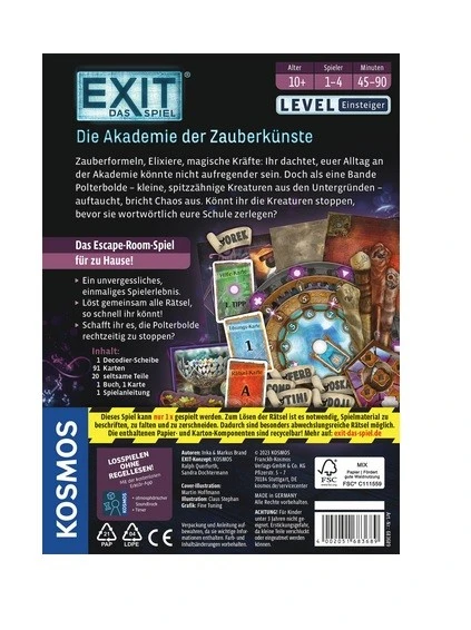 Die Polterbolde sind los! Und sie hinterlassen ein unglaubliches Chaos in der Akademie für Zauberei. Wie lassen sich die kleinen Kreaturen stoppen? Wo leben sie? Sie müssen so schnell wieder dorthin zurück, wo sie herkommen. Ein bis vier Spielerinnen und Spieler ab 10 Jahren haben viel über Zauberkräfte und die magische Welt gelernt. Schaffen es alle gemeinsam, die wilde Bande aufzuhalten? Eine ausführliche Anleitung, eine Decodier-Scheibe und viele Karten stehen dem Team für dieses Abenteuer bereit. Sie müssen schnell die Rätsel lösen, bevor die Akademie komplett zerstört wird!