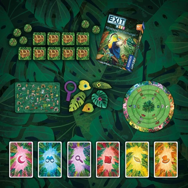 Ein Rätselabenteuer im Dschungel: im Team oder alleine lösen die Kinder abwechslungsreiche Rätsel, um Schatzkisten zu öffnen. Spielerisch werden sie an bekannte Mechanismen von EXIT®- Das Spiel herangeführt. In jeder Runde werden sechs unterschiedliche Rätselarten, die auf 36 großformatigen Bildkarten abgebildet sind, neu kombiniert. Somit ist das Spiel wiederspielbar und garantiert ein neues Spielerlebnis für jede Runde.