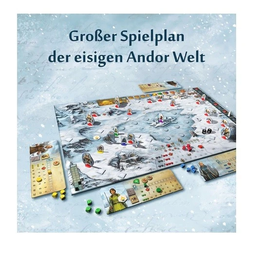 Die ewige Kälte ist ein eigenständiges Spiel zum preisgekrönten Abenteuer-Bestseller „Die Legenden von Andor“. Brrr! Eis und Schnee bedecken Andor. Das ganze Land leidet unter den eisigen Temperaturen. Wer steckt hinter der magischen Bedrohung? Krieger, Wächterin des Feuers, Zwerg und Zauberin begeben sich auf eine gefahrenvolle Reise. In vier großen Legenden kommen die 2-4 Spielerinnen und Spieler ab 10 Jahren dem Gegner immer näher. Das Team entdeckt gemeinsam unbekannte Regionen, übt sich in Kräuterkunde und findet neue Verbündete. Doch aufgepasst: Im Schnee lauern zahlreiche Gefahren. • Spannendes Fantasy Brettspiel, perfekt für einen Spieleabend oder als Geschenk für Erwachsene. • Inhalt: 1 großer, beidseitig illustrierter Spielplan, 4 Heldentafeln, 72 Legendenkarten, 40 illustrierte Spielfiguren in Kunststoffhaltern, 1 Erzähler-Figur, 16 Würfel, 90 Kartonplättchen, 16 Anzeigesteine aus Holz, 1 Losspiel-Anleitung, 1 Begleitheft