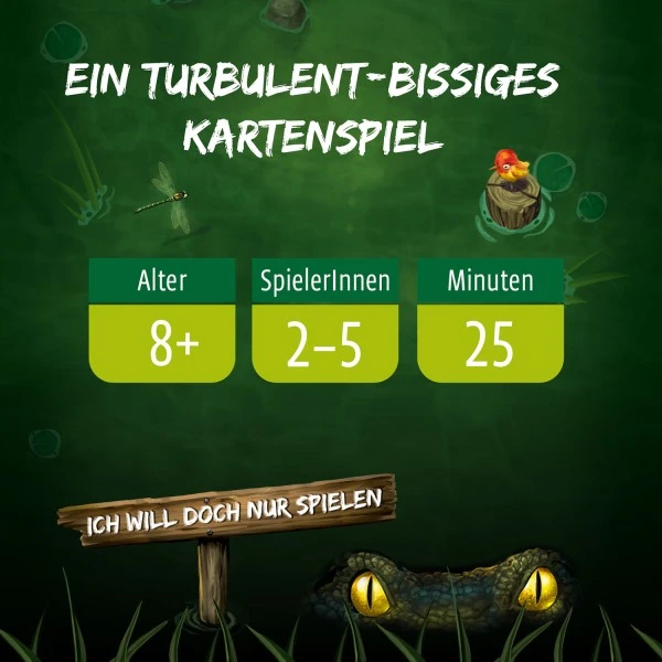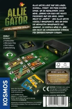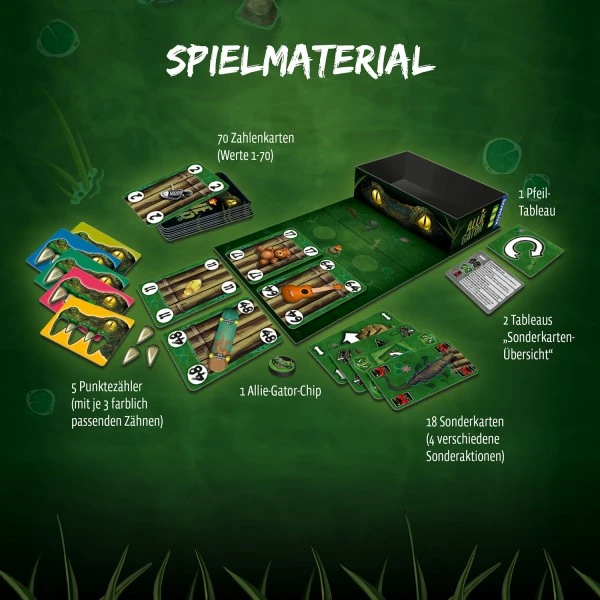 • Inhalt: 88 Karten, 5 Punktezähler, 1 Allie-Gator-Holzchip, 1 Pfeil-Tableau, 1 Spielanleitung