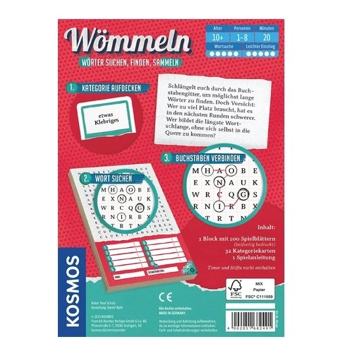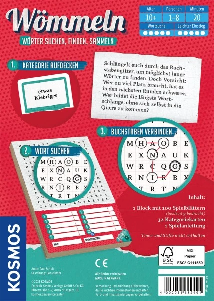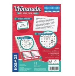 Wömmeln ist ein tolles Wortsuchspiel für 1-8 Personen. Ihr müßt Wörter finden und eine möglichst lange Wörterschlange bilden: In diesem kurzweiligen Familienspiel sucht ihr in eurem eigenen Buchstabengitter die passenden Begriffe zu einer Kategorie. Das Wort ist besonders lang? Das gibt viele Punkte! Aber Vorsicht: Längere Wörter bedeuten auch weniger Platz auf dem Buchstabengitter. Von Runde zu Runde wird es kniffliger, die eigenen Wörter zu platzieren. Wer bildet die längste Wörterschlange, ohne sich selbst in den Weg zu schlängeln? Kompakt und immer dabei – das ideale Spiel für unterwegs.
