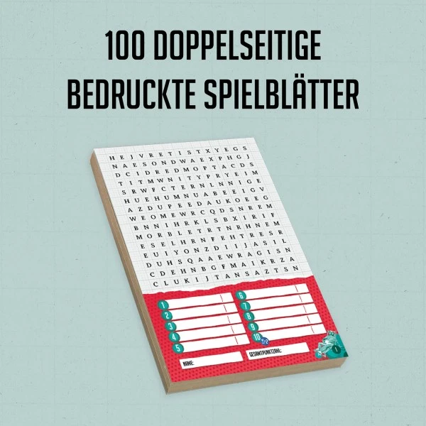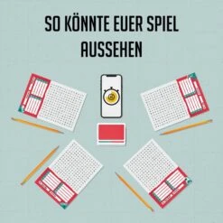 • Inhalt: 1 Block mit 100 Spielblättern (beidseitig bedruckt), 32 Kategoriekarten, 1 Spielanleitung