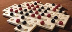Inhalt: 17 Holzplatten, 56 Glasmurmeln, Spielanleitung