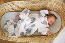 Das multifunktionale, nachhaltige Einschlag- und Mulltuch von LÄSSIG ist zu 70% aus einer atmungsaktiven, pflegeleichten Viskose aus Bambusfaser, einem schnell nachwachsenden Rohstoff sowie zu 30% aus Baumwolle gefertigt.