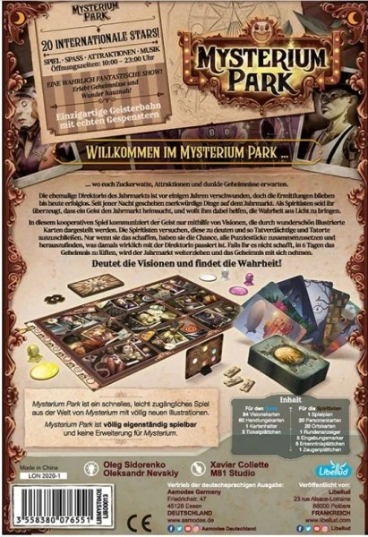 • Als Spiritisten (alle anderen Spieler) müsst ihr zuerst je einen Tatverdächtigen und danach je einen Tatort ausschließen. Dabei helft ihr euch gegenseitig, die Visionskarten des Geistes zu deuten. • Kompakte Variante des Klassikers Mysterium mit vereinfachten Regeln und Zirkus-Thematik • für 2-6 Personen ab 10 Jahren