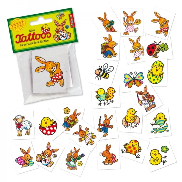 Gleich 24 tolle Lutz Mauder Oster Mini Tattoos im Set. Leicht auf die Haut zu bringen und leicht wieder zu entfernen! Natürlich ungiftig in in Übereinstimmung mit der EU Gesundheitsrichtlinie.