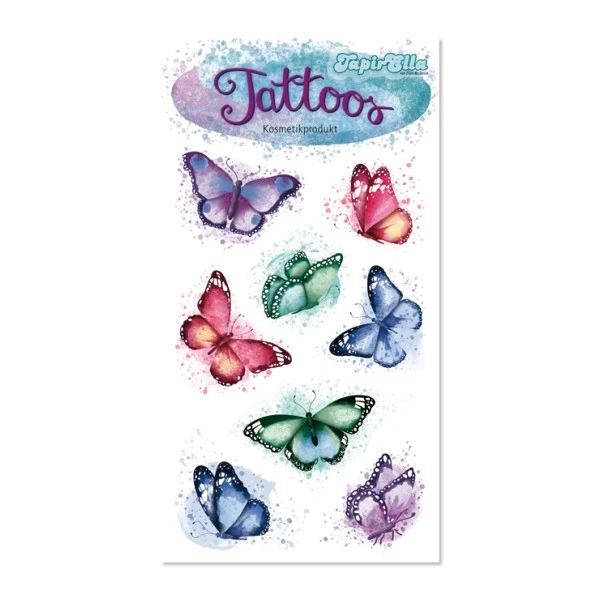 Tattooblättchen (5,6cm x 10,5cm) mit mehreren Motiven. Die Nass-Tattoos aus dem Lutz Mauder Verlag haften auf der Haut sind ungiftig, reizfrei und leicht zu entfernen.