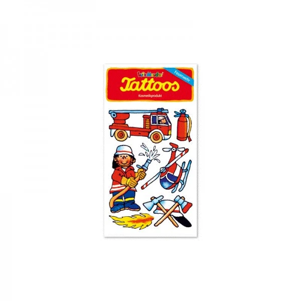 Tattooblättchen (5,6cm x 10,5cm) mit mehreren Motiven. Die Feuerwehrtattoos von Lutz Mauder haften auf der Haut sind ungiftig, reizfrei und jederzeit leicht zu entfernen.