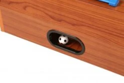 Der ideale Spielspaß für die ganze Familie. Bei diesem Tischfußball wurde besonders viel Wert auf die Sicherheit im Spielbetrieb gelegt. Deshalb ist der „Mini-Kicker“ mit Teleskopstangen ausgestattet. Diese Version ist daher auch mit kleineren Kindern bedenkenlos einsetzbar. Der 15 mm starke, sehr robuste MDF-Korpus ist in Kirschholz-Optik beschichtet. Das ca. 78 x 48 cm große MDF-Spielfeld wurde mit Melamin beschichtet und ist daher sehr pflegeleicht.