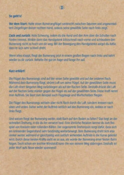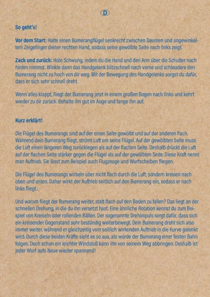 • inklusive spannender Informationen zu den physikalischen Prinzipien eines Bumerangs im Inneren der Verpackung