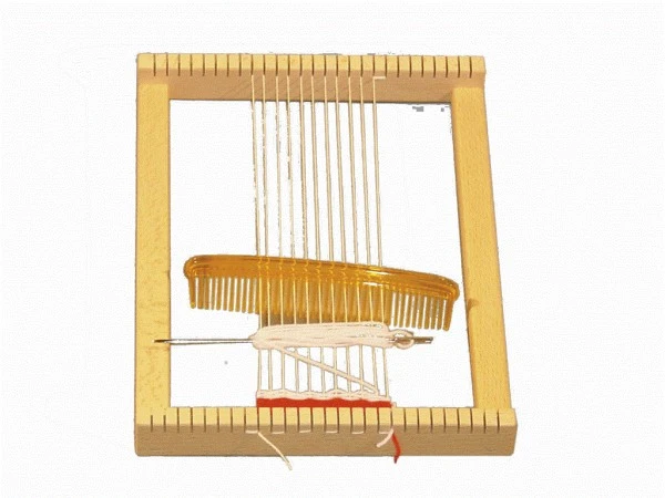 – Webrahmen aus Holz, Webnadel, Anschlagkamm, 2 Metallschienen.