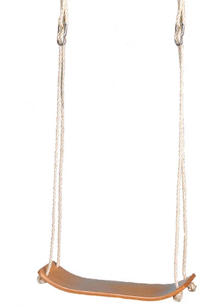 Diese Brettschaukel aus Holz hat ein gebogenes Schaukelbrett. Es ist gewachst.