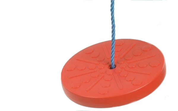 Leuchtend rote Tellerschaukel aus recyclingfähigem Polyetylen. Das Seil ist mit Stellachten justierbar.