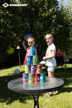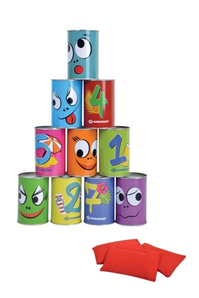 Mit diesem Dosenwurfspiel von Schildkröt habt ihr ruckzuck im Garten oder in der Wohnung eine witzige Spielstation aufgebaut. Die 10 Blechdosen werden aufgestellt und müssen bestenfalls mit den 3 Wurfsäckchen in drei Würfen abgeräumt werden. Dann wieder aufbauen und die nächste Person ist dran. Ein super Spiel auch für Kindergeburtstage. • 10 Metalldosen mit witzigen Motiven • Maße Dose 10cm x 6,5cm • 3 Wurfsäcke inclusive (7cm x 11cm) • ab 3 Jahren • Wurfspiel für die ganze Familie