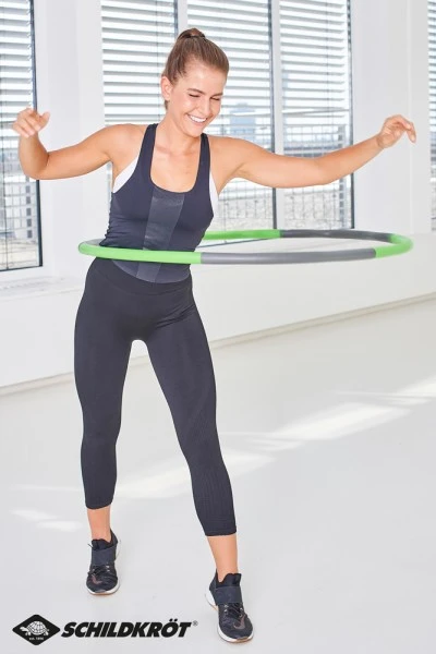 Hula Reifen um die Hüften zu Schwingen macht Spaß und bringt uns ganz schön in Wallung! Da macht es Sinn, auch gleich ein richtiges Fitnessgerät daraus zu machen: das ist der Schildkröt Fitness Hoop. Hier eine eher große schwere Variante in grün-dunkelgrau.
