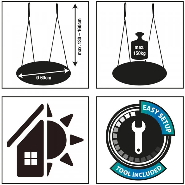 • Materialien:4 formstabilen Stahlrohre (25mm x 0,8mm) mit Aufprallschutz, Sitzfläche aus widerstandsfähigem Kunststoffgeflecht (Polypropylen), PE-Tragseile (Ø 10mm)