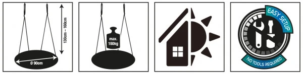• Materialien:4 formstabilen Stahlrohre (25mm x 0,8mm) mit Aufprallschutz, Sitzfläche aus widerstandsfähigem Kunststoffgeflecht (Polypropylen), PE-Tragseile (Ø 10mm)