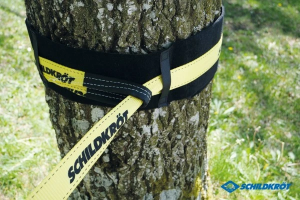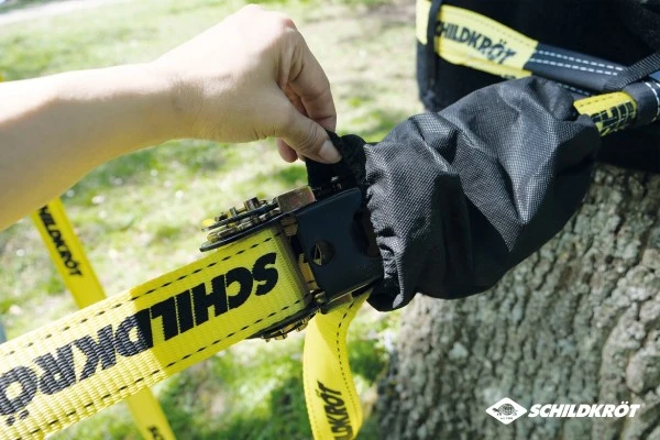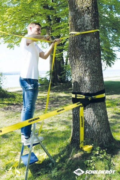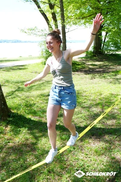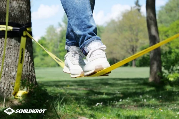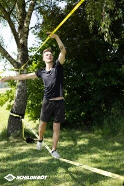 Von Schildkröt haben wir hier ein ganz tolles Slackline-Einstiegsset im Sortiment. Natürlich ist die klassische 5cm breite Slackline dabei und zwar 15 Meter Länge und in Gelb. Dazu gibt es aber auch gleich die sogenannte Teachline. Das ist ein dünneres Gurtseil, das ein Stück höher im Baum gespannt wird. Dieses Halteseil dient zum Festhalten beim Balancieren. Sich oben festzuhalten hat den Vorteil, dass die aufrechte Körperhaltung auf der Slackline beibehalten wird. Wird man von einer Person an der Seite gehalten, steht man in der Regel zu schief und zu tief!