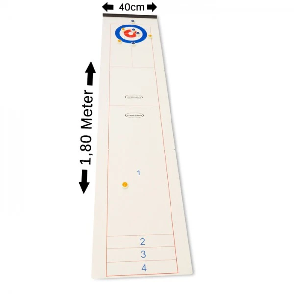 Die Spielbahn ist 1,80m lang und 40cm breit. Sie besteht aus 3 einzelnen Teilen, die per Magnetstreifen miteinander befestigt werden. Je nachdem, welche Markierungen genutzt werden, kann Shuffleboard oder Curling (Eisstockschiessen) gespielt werden. Die Spielsteine gleiten dabei über die lange Bahn. Hier kann die ganze Familie (ab ca. 4 Jahren) mitspielen.