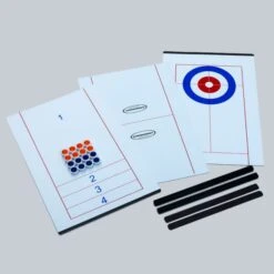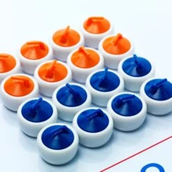 • Inhalt: 3-teilige Spielbahn, 2 magnetische Bahnverbindungsstücke,1 Steinstopper, 8 blaue Curling-Steine, 8 orange Curling-Steine, 1 Schwämmchen, 2 Aufbewahrungsbeutel
