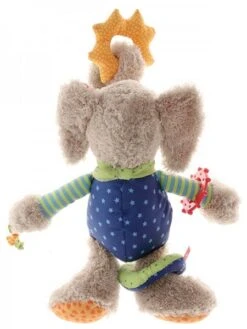 Der fantasievoll gestaltete Aktiv-Elefant von Sigikid ist kuschelig weich und mit super tollen Spiel- und Entdeckungsmöglichkeiten ausgestattet. Der bunte Elefant ist ein richtiger Blickfang, reich geschmückt mit zahlreichen Muster- und Materialmixen. Diese bieten eine Menge Greifmöglichkeiten. Ein genoppter Ring am Elefantenarm bietet eine super Biss-Fläche für erste Zähnchen. Weitere tolle Effekte bieten eine Vibrationsrassel am Fuß, und eine Quietsche und eine Knisterfolie in den Ohren. Das animiert das Kind zum Ziehen, Schütteln und Knistern und verspricht tolle erste haptische Erfahrungen. Ein wirklich (ele)fantastisches Stofftier!