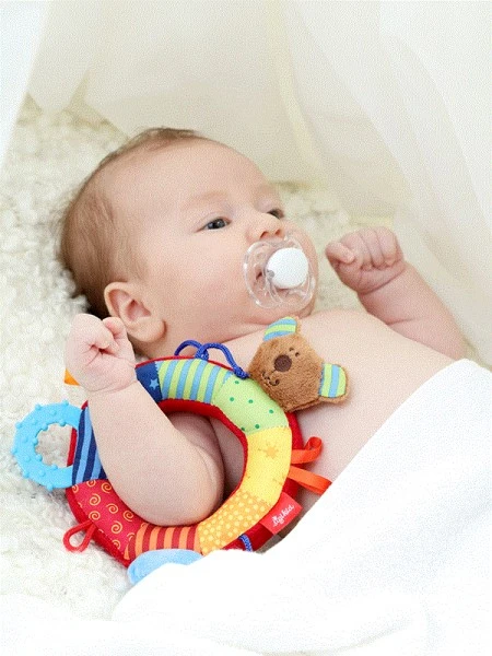 Der multifunktionale kunterbunte Ring mit dem süßen Bärenkopf ist mit super tollen Spiel- und Entdeckungsmöglichkeiten ausgestattet. Der Ring ist ein richtiger Blickfang, reich geschmückt mit zahlreichen Muster- und Materialmixen. Rassel, Knisterfolie oder Beißring, der Aktiv-Ring ist perfekt für die verschiedenen Aktiv-Phasen ihres Babys.